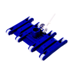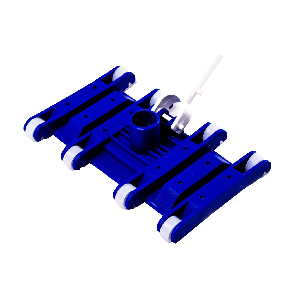 Aspirador plástico, com peso interno para evitar flutuação. Possui 8 rodas com eixos individuais e cabo plástico pronto para ser acoplado a um cabo de alumínio.